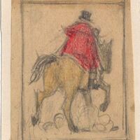 En este dibujo encuadrado se ve de espalda un jinete con capa roja y sombrero negro sobre un caballo castaño claro al galope. A su paso va soltando una polvareda representada mediante líneas ondulantes de color grisáceo.Boceto realizado para la ilustración de la revista semanal Novelas y Cuentos. Titulo: Guy Manhering o El Astrologo. Autor: Walter Scott. Nº publicado: 1334. Fecha: 02-12-1956. Tomo NC. 34.