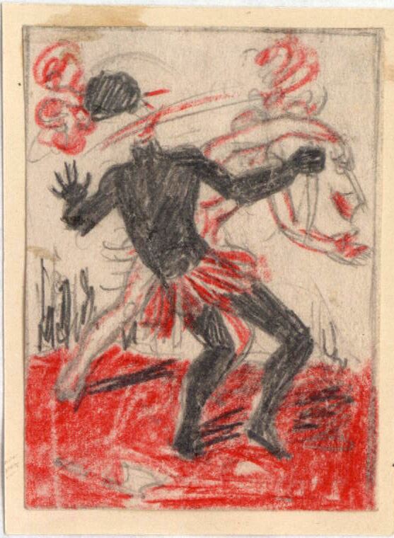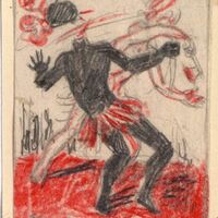 En una escena de lucha destaca un hombre blanco que con violencia corta la cabeza a un hombre negro semidesnudo, pues solamente le cubre una falda de flecos roja. El negro se encuentra de espaldas hacia el observador. Caída sobre un suelo de intenso color rojo hay un hacha de color blanco. El dibujo se halla enmarcado.Boceto realizado para la ilustración de la revista semanal Novelas y cuentos. Titulo: Las minas del rey Salomon. Autor: R. Pider Haggard. Nº publicado 821. Fecha: 02-02-1947. Tomo NC. 11