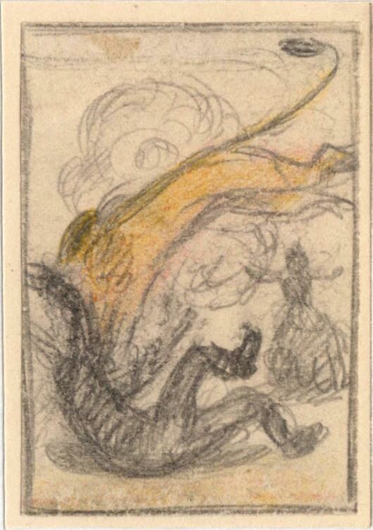 - Una mujer pide socorro al ver que un león se ha tirado encima de su marido. El león es de color amarillo mientras que las dos figuras humanas son de color blanco y negro. El dibujo está enmarcado.Boceto realizado para la ilustración de la revista semanal Novelas y Cuentos. Titulo: Autor: Nº publicado: Fecha: Tomo NC.
