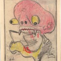 En este dibujo enmarcado que el pintor ha firmado se representa a una extraña figura sentada con la cabeza enorme de color rosa. También son de grandes proporciones sus ojos amarillos y su boca de la que salen extensos y afilados dientes. Su cuerpo amarillo, sin embargo, es más pequeño.Boceto realizado para la ilustración de la revista semanal Novelas y Cuentos. Titulo: El ajedrez vivo de Marte. Autor: Edgar Rice Burroughs. Nº publicado: 998. Fecha: 26-06-1950. Tomo NC. 47.
