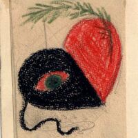 Escena en la que se aprecia un gran corazón dividido en dos partes. La parte izquierda del corazón es de color negro donde está dibujado un ojo y la parte derecha es de color rojo en donde aparece el dibujo de una rama en tonos verdes. El dibujo está enmarcado con lápiz.Boceto realizado para la ilustración de la revista Novelas y Cuentos: Titulo: El Apache; Autor: Paul Bourget; nº publicación: 1.079; Fecha: 13-01-1952; Tomo NC/ 42; Prueba de Imprenta nº 106