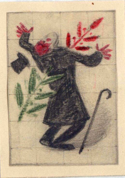 La figura de un anciano de cabellos, barbas blancas y traje negro se contornea con dolor al ser atravesado por una gran rama, cuyos extremos son verde en la parte de la espalda y roja (sangre) en su pecho. Un sombrero y un bastón pertenecientes al anciano caen a causa del movimiento. El dibujo está enmarcado y su superficie está cuadriculadaBoceto realizado para la ilustración de la revista Novelas y Cuentos: Titulo: Autor: Nº publc.: Fecha: TomoNC: PI/. 352