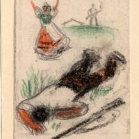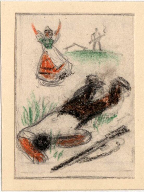 Una mujer corre y agita desesperadamente los brazos hacia arriba ante la visión de su marido muerto que yace en el suelo. El agresor, cuya figura se ve diminuta por lo alejada que está, sostiene entre sus manos una escopeta, arma del crimen. En el horizonte se vislumbra, tras un pequeño monte, el tejado de una casa. El dibujo está enmarcado.Boceto realizado para la ilustración de la revista semanal Novelas y Cuentos. Titulo: Mariana Sirca. Autor: Gracia Decedda. Nº publicado: 935. Fecha: 10-04-1949. Tomo NC. 10.