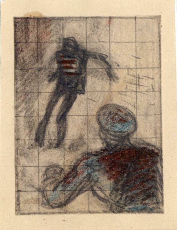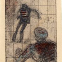 En una atmósfera oscura, sobre una pared se apoya un hombre que parece tener dificultades, quizás por estar acorralado. En primer término y de espalda un hombre, que parece ser policía por la gorra que lleva, le hace señales. El dibujo está enmarcado y el dibujo realizado sobre una cuadricula.Boceto realizado para la ilustración de la revista semanal Novelas y cuentos. Titulo: Policias y Ladrones. Autor: Jhon Russell. Nº publicado: 767. Fecha: 20-01-1946. Tomo NC. 7