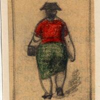 En este dibujo enmarcado pasea una mujer corpulenta de espalda llevando un bolso negro. Su falda es verde, su camiseta de manga corta es roja y su sombrero un tricornio de la guardia civil, y zapatos son negros.Boceto realizado para la ilustración de la revista semanal Novelas y Cuentos. Titulo: La pluma verde. Autor: Muñoz Seca y Perez Fernández. Nº publicado: 1188. Fecha: 14-02-1954. Tomo NC. 54.