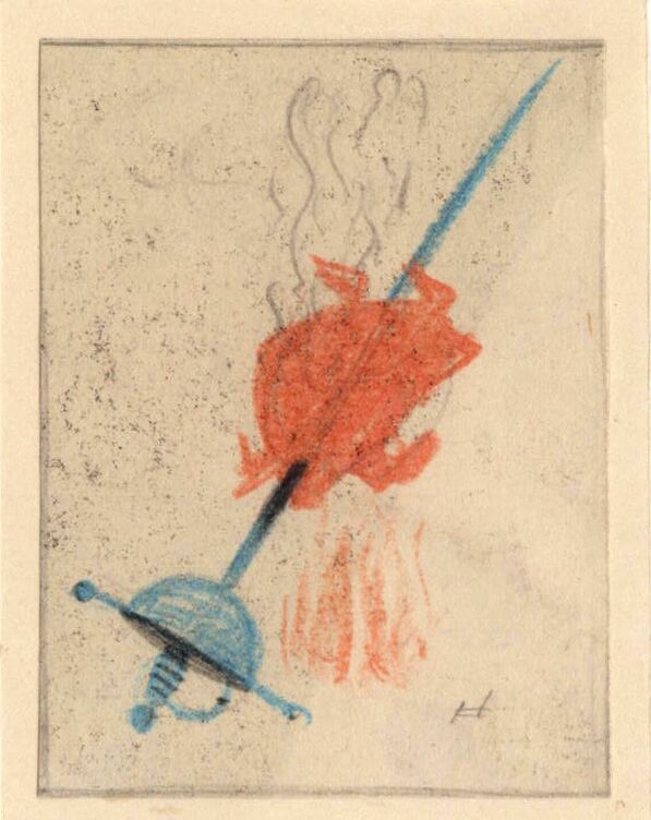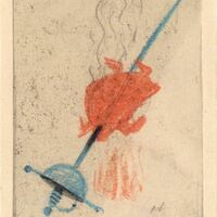 Espetado en un florete azul es asado un pollo bajo una pequeña hoguera de llamas rojizas. Del pollo se desprende un ligero humo. La imagen donde se vislumbra el boceto de la firma del artista se halla en un dibujo enmarcado.Boceto realizado para la ilusstracion de la revista semanal Novelas y Cuentos. Titulo: Mi tío Benjamin. Autor: Claudio Tillier. Nº publicado: 957. Fecha: 11-09-1949. Tomo NC. 11.
