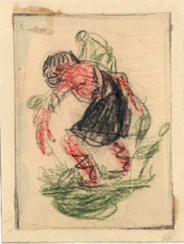 - Envuelto en ramajes verdosos se encuentra un chico medio agachado, ladeado y torciendo la cabeza. Su única vestimenta es una piel negra que le cubre el cuerpo. El dibujo se halla enmarcado.Boceto realizado para la ilustración de la revista semanal Novelas y Cuentos. Titulo: Autor: Nº publicado: Fecha: Tomo NC.