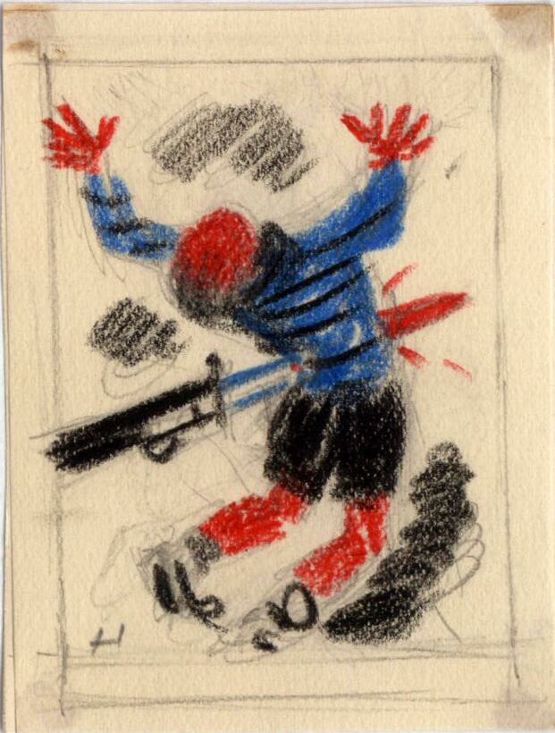 En este dibujo enmarcado y firmado por su autor un niño, que aparece de espalda, se retuerce al ser atravesado por el filo de una balloneta cuyo mango parece el de una escopeta. Su traje es un pantalón corto de color negro, una camiseta a rayas blancas y azules y zapatos oscuros.Boceto realizado para la ilustración de la revista semanal Novelas y Cuentos. Titulo: Muy reservado. Autor: Nevil Shute. Nº publicado: 1135. Fecha: 08-02-1953. Tomo NC. 44.
