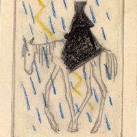 Bajo una tempestad de tormenta y lluvia intensa, adivinada por las pequeñas manchas azules en forma de lágrima y el rayo amarillo, cabalga un jinete con una larga capa negra sobre un caballo escuálido de color blanco con las patas muy altas. La figura en este dibujo enmarcado aparece de perfil.Boceto realizado para la ilustración de la revista semanal Novelas y Cuentos. Titulo: El fantasma del Dique. Autor: Teodoro Storn. Nº publicado: 1096. Fecha: 11-05-1952. Tomo NC. 44.