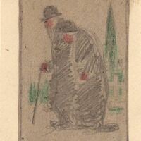 Teniendo como fondo un jardín adivinado por unos árboles verdes que se vislumbran a lo lejos, una pareja de ancianos encorvados, por el peso de su edad, y con sus trajes oscuros, llevando el hombre un baston, pasean agarrados el uno al otro. La pareja aparece de perfil en este dibujo enmarcado.Boceto realizado para la ilustración de la revista semanal Novelas y Cuentos. Titulo: Renata Mauperín. Autor: Edmundo y Julio Concourt. Nº publicado: 943. Fecha: 05-06-1949. Tomo NC. 7.