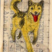 En este dibujo enmarcado y de superficie cuadriculada destaca la imagen de un perro de frente amarillo con manchas negras. Lleva la boca abierta. Detrás del dibujo parecen transparentarse algunas letras en tonos azules y en posición vertical de la cara de atrás del papel.Boceto realizado para la ilustración de la revista semanal Novelas y Cuentos. Titulo: La llamada de la selva. Autor: Jack London. Nº publicado: 1060. Fecha: 02-09-1951. Tomo NC. 60.