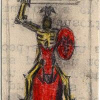 Un boceto de la firma del pintor acompaña esta imagen enmarcada en la que se ve de frente a un guerrero esqueleto con su casco sobre un caballo cubierto por una manta roja. En su mano derecha empuña una espada y en la izquierda lleva un escudo redondo de color rojo con algo dibujado en negro.Boceto realizado para la ilustrqacion de la revista semanal Novelas y Cuentos. Titulo: El castillo peligroso. Autor:Walter Scott. Nº publicado: 1182. Fecha: 03-01-1954. Tomo NC. 46 y 54.