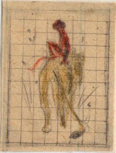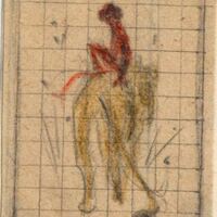 - Un león dorado con una gran cola que se ve de espalda lleva encima a un mono de piel oscura que se vuelve hacia atrás. El dibujo está ligeramente enmarcado y sobre una superficie cuadriculada.Boceto realizado para la ilustración de la revista semanal Novelas y Cuentos. Titulo: Kurika. Autor: Enrique Galvao. Nº publicado: 1281. Fecha: 27-11-1955. Tomo NC.: 51 .