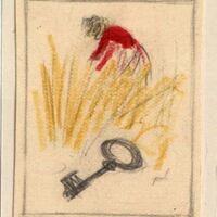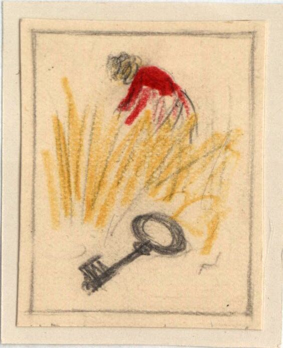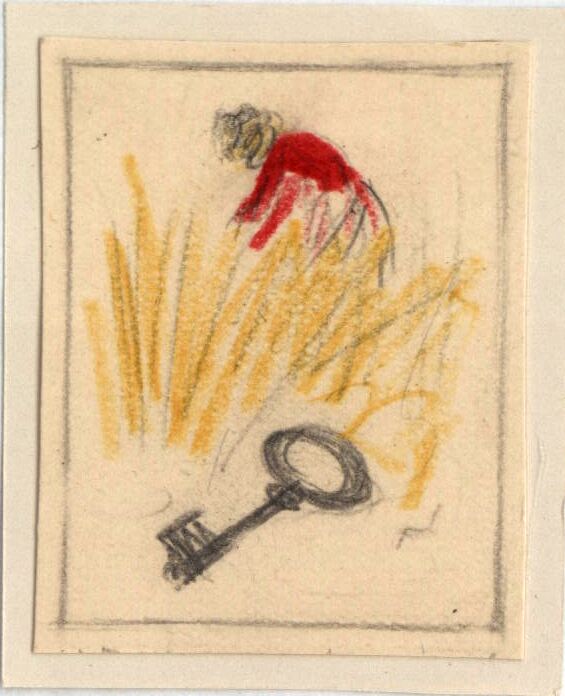 En primer plano se vislumbra la imagen de una llave negra y grande caída en el suelo. Al fondo, en segundo plano, una mujer con traje rojo y blanco busca en los campos de trigo de tamaño alto y dorado su llave. El dibujo está enmarcado y está presente el boceto de la firma del artista.Boceto realizado para la ilustración de la revista semanal Novelas y Cuentos. Titulo: Duende de amor. Autor: P. Ortiz< de Pinedo. Nº publicado: 1194. Fecha: 28-03-1954. Tomo NC.: 38.