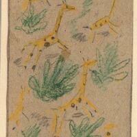 En un paisaje natural adivinado por los pequeños matorrales que crecen en el suelo, corren un buen grupo de jirafas de color amarillo con manchas negras. El dibujo está enmarcado.Boceto realizado para la ilustgracion de la revista semanal Novelas y Cuentos. Titulo: Cazadores de jirafvas. Autor: Maine Reid. Nº publicado: 1065. Fecha: 07-10-1951. Tomo NC.: 45.