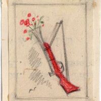 En este dibujo enmarcado y firmado por su autor se muestra la figura de una escopeta colgada en una pared con la posición de tiro hacia arriba de donde sale un ramo de flores silvestres. La escopeta es de color rojo y gris, por su parte de arriba. Una mancha grisácea configura su sombra.Boceto realizado para la ilustración de la revista semanal Novelas y Cuentos. Titulo El hijo de un ladron. Autor: Jules Mary. Nº publicado 1163. Fecha: 23-08-1953. Tomo NC.: 35