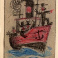 Navegando sobre las aguas azules del mar en este dibujo enmarcado se encuentra un barco de color rojo con una gran chimenea de la que sale un humo muy negro y una tripulación formada por hombres de tamaño pequeño, con traje negro, sombrero y espesos bigotes.Boceto realizado para la ilustración de la revista semanal Novelas y Cuentos. Titulo: Port-Tarascon. Autor: Alfonso Daudet. Nº publicado: 939. Fecha: 08-05-1949. Tomo NC.: 11.