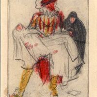 Tres figuras se representan en este dibujo enmarcado: en segundo plano un personaje femenino de negro y en primer término un caballero con sombrero y traje amarillento y rojizo que sostiene en sus brazos a una joven muerta con hábito blanco y ensangrentado. Todas las figuras se encuentran de frente.Boceto realizado para la ilusgtracion de la revista semanal Novelas y Cuentos. Titulo: Don Juan Tenorio. Autor: Jose Zorrilla. Nº publicado: 1015. Fecha: 22-10-1950. Tomo NC.: 35.