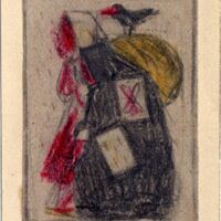 Parece que este dibujo enmarcado trata de mostrar una figura humana aunque no muy bien definida. Sus ropajes son de color negro y rojo. Sobre su espalda porta una bolsa amarilla y sobre ella, posado, un cuervo negro.Boceto realizado para la ilustración de la revista Novelas y Cuentos. Titulo: Oliesia. Autor: Alejandro Kuprin. Nº publc.: 1031. Fecha: 11-02-1951. Tomo NC. 49 PI/.514