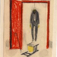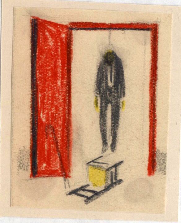 En el marco de una puerta roja abierta se encuentra un hombre ahorcado con el traje negro. Caída en el suelo hay una silla amarilla y una bengala negra apoyada en la puerta. El dibujo está ligeramente enmarcado.Boceto realizado para la ilustrqacion de la revista semanal Novels y Cuentos. Titulo: Los hombres. Autor: Alberto Insua. Nº publicado: 1326. Fecha: 07-10-1956. Tomo NC. 37.