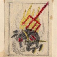 Un gran tridente rojo envuelto en llamas surge en este dibujo enmarcado espetando a un hombre por su espalda. El cuerpo del hombre parece inerte y se destaca en su persona un sombrero y un traje oscuro con algún adorno rojo y amarillo. Manchas oscuras crean sombras y humo.Boceto realizado para la ilustración de la revista semanal novelas y cuentos. Titulo: El Alcalde Ronquillo. Autor: Jose Zorrilla. Nº publicado: 1162. Fecha: 11-08-1953. Tomo NC.: 40.