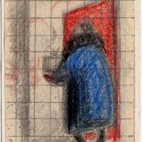 Una mujer de espalda con abrigo largo azul lleva en sus manos un regalo. A su llegada se abre una puerta roja dejando vislumbrar un interior en tonos claros. La superficie del dibujo está cuadriculada.Boceto realizado para la ilustración de la revista semanal Novelas y Cuentos. Titulo: La honradez de la cerradura. Autor: Jacinto Benavente. Nº publicado: 1255. Fecha: 29-05-1955. Tomo NC.: 34.