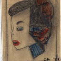 Con los rasgos muy marcados se representa el retrato de una joven con la piel muy blanca y el pelo oscuro recogido en un moño, labios semiabiertos rojos, ojos azules y el cuello azul . La figura aparece medio de perfil, ya que la cabeza está ligeramente torcida. En su pelo se adivina el dibujo de un hombre empuñando un revolver saliendo parte del cañón por el ojo izquierdoBoceto realizado para la ilustración de la revista semanal Novelas y Cuentos. Titulo. Autor: Nº publicado: Fecha: Tomo NC.: