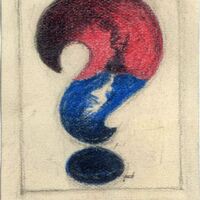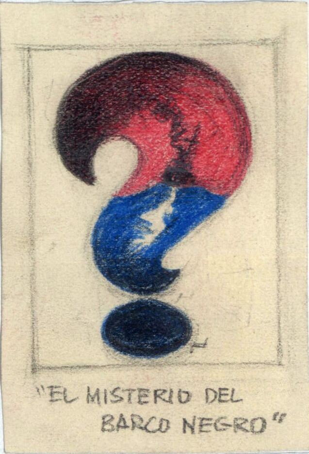 En el interior de un punto de interrogación se desarrolla una escena marítima donde un barco navega por las aguas azules y negras del mar. La mitad superior del punto de interrogación es de un color rojizo y la parte inferior es de color negra azulada. En el dibujo enmarcado se puede vislumbrar el boceto de la firma del pintor.Boceto realizado para la ilustración de la revista semanal Novelas y Cuentos. Titulo: El misterio del barco negro. Autor: Edgar Wallace. Nº publicado: 1241. Fecha: 20-02-1955. Tomo NC.: 58.