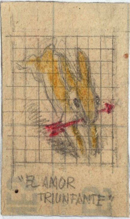 - En una superficie cuadriculada y en un dibujo enmarcado se ha representado a un conejo amarillo corriendo con una flecha roja en la boca.Boceto realizado para la ilustración de la revista semanal de Novelas y Cuentos. Titulo: El amor triunfante. Autor: Rene Bazin. Nº publicado: 1254. Fecha: 22-05-1955. Tomo NC.: 34.