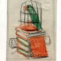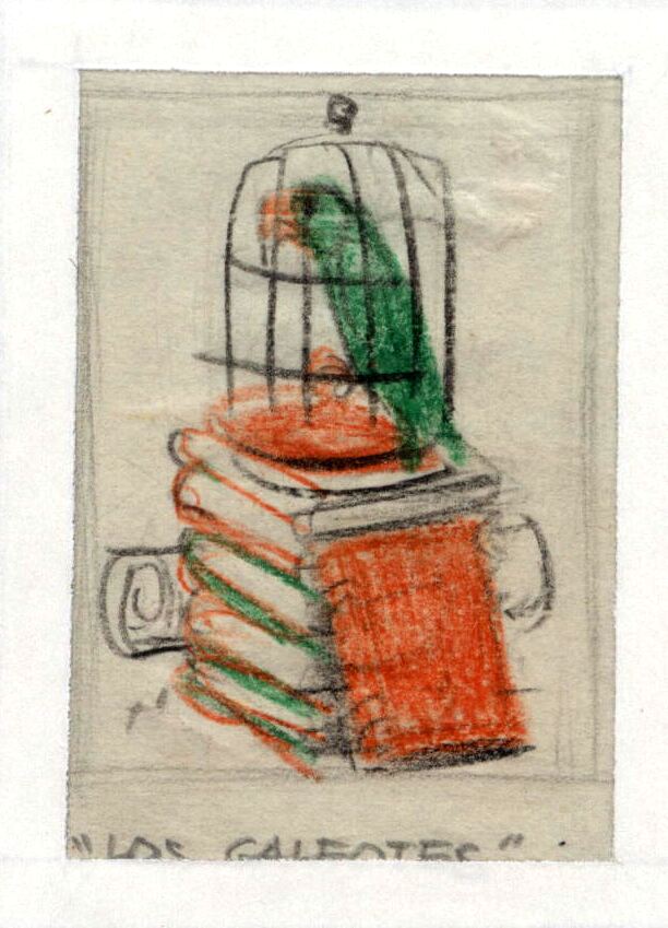 - Sobre una pila de libros con sus tapas rojas se encuentra un loro verde metido en una jaula abovedada. Un libro suelto en el suelo se apoya sobre los demás.Boceto realizado para la ilustración de la revista semanal Novelas y Cuentos. Titulo: Los galeotes 1. Autor: Nº publicado: Fecha: Tomo NC.: