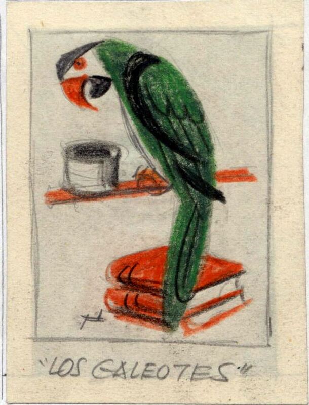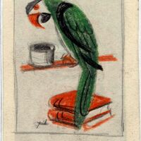 En este dibujo enmarcado, donde se puede apreciar el boceto de la firma del pintor, se ha dibujado a un loro con pelaje verde y pico rojo sobre una barra, en la que también se encuentra un bote pequeño blanco. El loro se encuentra con el cuerpo ladeado girando su cabeza. Debajo destaca una pila de libros con las tapas rojas.Boceto realizado para la ilustración de la revista semanal Novelas y Cuentos. Titulo: Los galeotes. Autor: Nº publicado: Fecha: Tomo NC.: