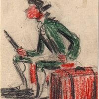 En una posición ladeada o de perfil está situado un soldado del siglo XIX de traje verde con su fusil y sobre su cabeza lleva un sombrero de color negro. A su lado, una maleta roja.Boceto realizado para la ilusgtración de la revista Novelas y Cuentos. Titulo: Los herederos del Comendador. Autor: Poson Du Terrail. Nº public.: 861. Fecha: 09-11-1949. Tomo NC. 19. PI/. 309