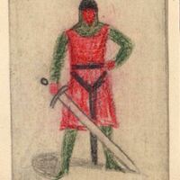 La imagen enmarcada se centra en la figura de un guerrero de época medieval con la espada en su mano derecha, dejando la izquierda libre que apoya sobre su cadera. Su vestimenta es verde, su cota de malla es rosácea y su cinturón negro. En su cabeza lleva un yelmo de color negroBoceto realizado para la ilustración de la revista Nove3las y Cuentos. Titulo: Las Mocedades del Cid. Autor: Guillen de Castro. Nº publicado: 879. Fecha: 14-03-1948. Tomo NC: 6. PI/. 334.