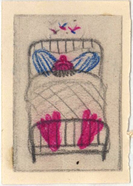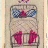 Se representa en este dibujo enmarcado una cama de rejas con sábanas en tonos claros. En ella duerme una figura masculina dejando entrever sus extremidades de color rosáceo y un pijama a rayas blancas y azules. Por encima revolotean unos insectos azules y rosas.Boceto realizado para la ilustración de la revista Novelas y Cuentos. Titulo: Inquietud e Indecisión. Autor: Iván Goncharov. Nº public.: 979. Fecha: 12-02-1950. Tomo NC.: 23. PI/. 359
