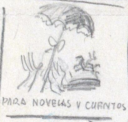 - “Para novelas y cuentos” se ha realizado una imagen en la que se representa una sombrilla con un lazo, abierta y sujeta por unas manos femeninas. En un segundo plano se aprecia una figura a caballo. Destaca el color blanco grisáceo. Líneas abocetadas intentan enmarcar el dibujo.Bocetos realizados para Novelas y Cuentos.