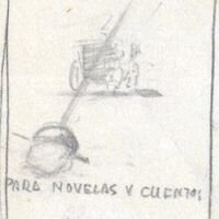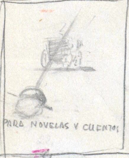 - “Para novelas y cuentos” a modo de boceto y en donde se destacan los colores grises y blancos se ha dibujado, saliendo de la parte de la derecha, una mano que sostiene una espada. En un segundo plano se ve a un carro de caballos. Una línea torcida y abocetada intenta crear un marco al dibujo.