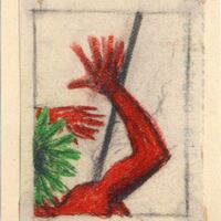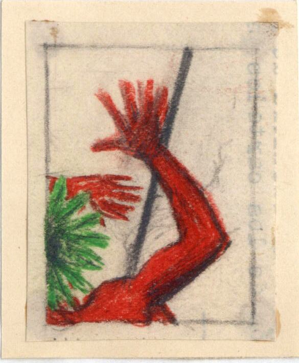 Enmarcada en un cuadrado a lápiz aparece una figura humana rojiza, con cabellera verde y con los brazos hacia arriba. Una especie de lanza negra y de largas dimensiones atraviesa el cuerpo de la figura que parece ser un hombre.Boceto realizado para la ilustración de la revista Novelas y Cuentos. Titulo: La Hermana Desaparecida. Autor: Mayne Reid. Nº publicado: 1145. Fecha: 19-04-1953. Tomo NC.: 31 y 42. PI/.: 528