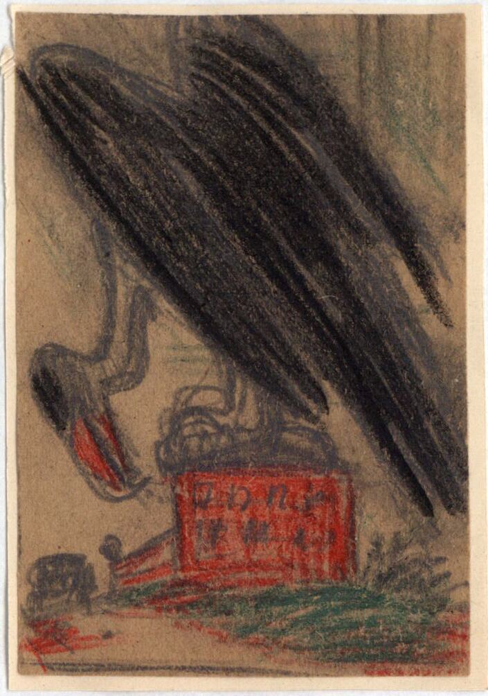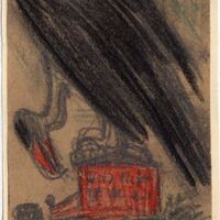 Un buitre negro, con el pico rojo, de grandes dimensiones y con la cabeza cabizbaja se apoya sobre la diminuta figura de una casa pintada en color rojo. Alrededor de la casa parece divisarse un pequeño jardín en tonos verdosos.Boceto realizado para la ilustración de la revista Novelas y Cuentos. Titulo: El Gran Negocio en Brillantes. Autor: William Magnay. Nº public.: 849. Fecha 17-08-1947. Tomo NC.: 19. PI/.: 298