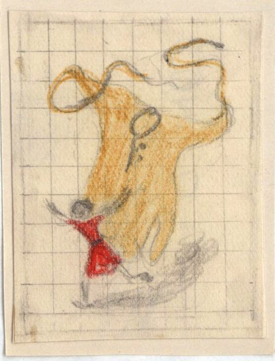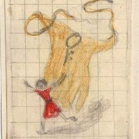 Sobre un fondo cuadriculado se sitúan dos figuras en gran movimiento. Una niña con un vestido rojo corre asustada ante la persecución de un fantasma en forma de un camisón de color amarillo y con grandes mangas.Castillo de orsdael. Autor: Enrique Conscience. Nº public.: 1240. Fecha: 13-02-1955. Tomo Boceto realizado para la ilustración de la revista Novelas y Cuentos. Titulo:El NC.: 42.