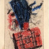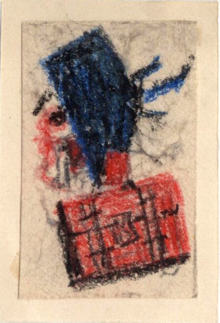 De una forma no muy bien definida parece apreciarse el tronco de una figura masculina de perfil con un traje azul oscuro y una mano roja llevando en la mano un maletín rojo. El dibujo está enmarcado.Boceto realizado para la ilustración de la revista Novelas y Cuentos. Titulo: Más Allá de Dover. Autor: Val Gielgud. Nº public. 1052. Fecha: 15-07-1951. Tomo NC.: 29. PI/.482.