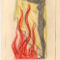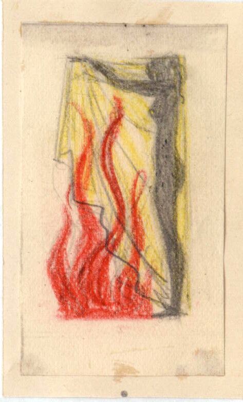 - Tres elementos forman la imagen de este dibujo: una mujer de pie, alta, negra y desnuda situada en la izquierda; una sábana amarilla sujeta entre las manos de la figura femenina; por último, una gran hoguera de llamas rojas, en el centro junto a la sábana.