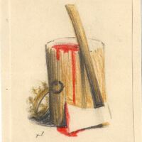 Sobre un cubo amarillento del que salen manchas rojas pareciendo sangre se apoya el hacha de la ejecución real, manchada igualmente de rojo. En este caso se puede apreciar el posible boceto de la firma del artista.Boceto realizado para la ilustración de la revista semanal Novelas y Cuentos. Titulo: María Estuardo. Autor: Federico Shiller. Nº public.: 1099. Fecha: 01-06-1952. Tomo NC.: 39. PI/. 183.