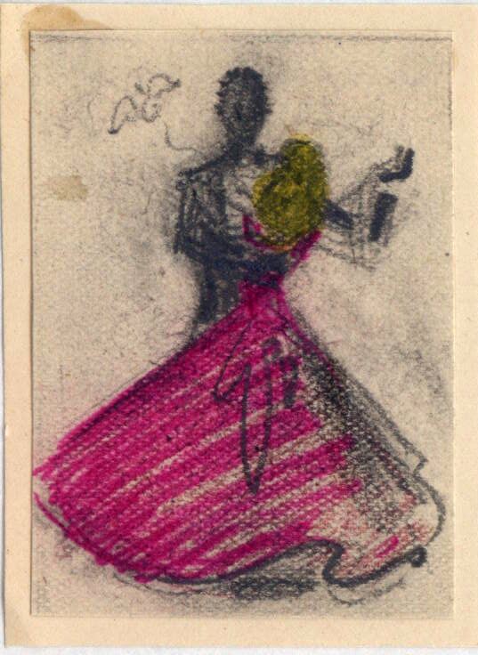 Una pareja de bailarines aparece en primer término. El hombre va vestido con un traje en negro y blanco mientras que la bailarina, una joven rubia, lleva un vestido largo de color fucsia. Una escena en la que se aprecia el movimiento de la danza. El dibujo se encuentra enmarcado.Boceto realizado para la ilustración de la revista Novelas y Cuentos: Titulo: Autor: Nº publicado: Fecha Tomo NC/. No; Prueba de Imprenta 446