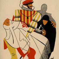 Un caballero, en el que destaca un traje de gran riqueza, de color amarillo con rayas rojas, una gola blanca y un sombrero rojo con penacho blanco, sostiene en sus brazos a una figura femenina desmayada con un hábito blanco y con un adorno rojo sobre su pecho. En un segundo plano se ve la imagen de una mujer de negro y encorvada. En el dibujo está presente la firma del pintor.Prueba de imprenta. Ilustración realizada para la revista semanal Novelas y Cuentos. Titulo: Don Juan Tenorio. Autor: José Zorrilla. Nº publicado: 1015. Fecha: 22-10-1950. Tomo NC. 35.