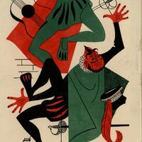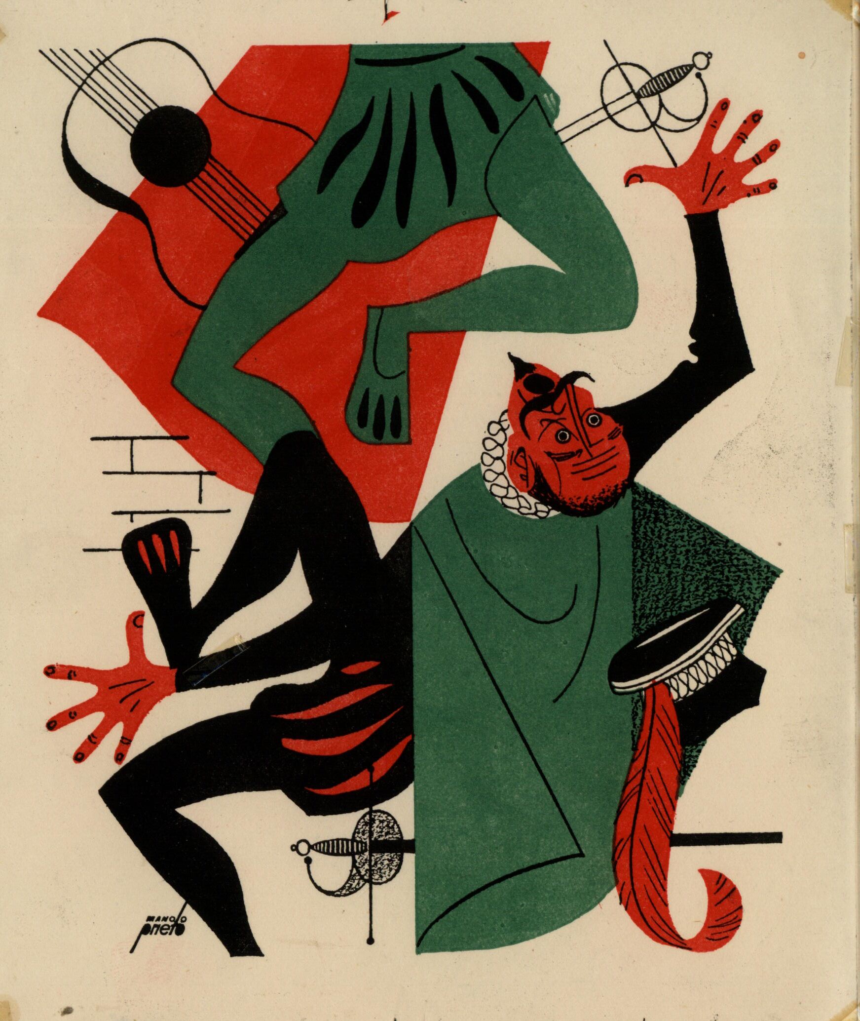 En una extraña posición se vislumbra a un caballero con el traje negro y algunas rayas rojas, una gran capa verde y una gola blanca. Se ve también otra figura de la que solamente se adivinan sus piernas y un traje verde. Una guitarra también toma lugar en la composición firmada.Prueba de imprenta. Ilustración realizada para la revista semanal Novelas y Cuentos. Titulo: La vida azarosa de D. Gregorio Guadaña. Autor: Antonio Enríquez Gómez. Nº publicado: 1034. Fecha: 04-03-1951. Tomo NC. 39.
