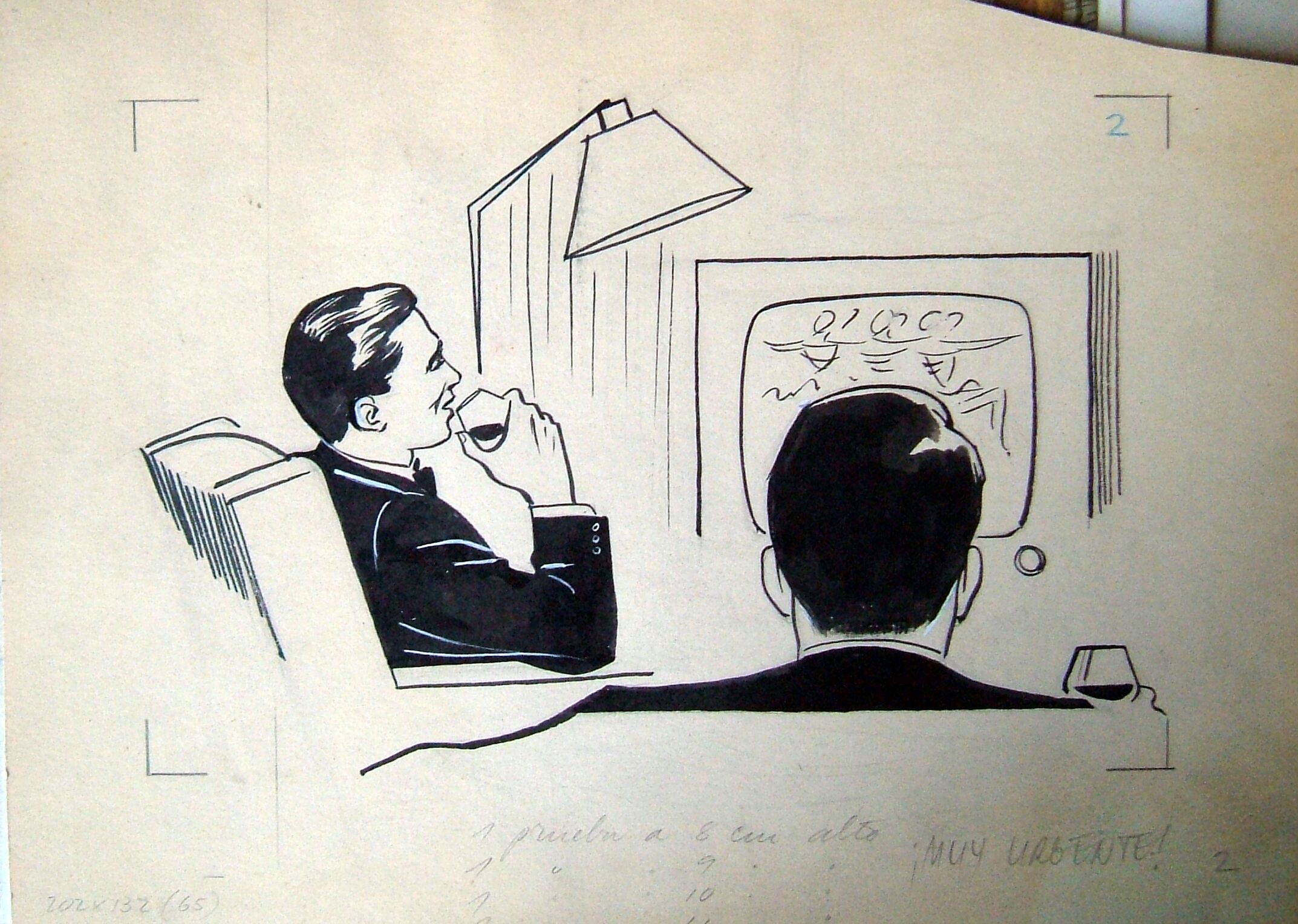 - Con un juego de trazos negros sobre fondo blanco se representa la escena de dos hombres de espaldas, vestido de etiqueta sentados frente a la televisión, mientras beben de sus copas, con unas anotaciones a lápiz donde se puede leer “urgente.”