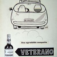 - Dibujo con la silueta de un coche con maletas encima de la baca y el piloto de espaldas saludando con su mano y al lado como copiloto una copa, debajo un cartel cuya dirección apunta a una botella de veterano Osborne.