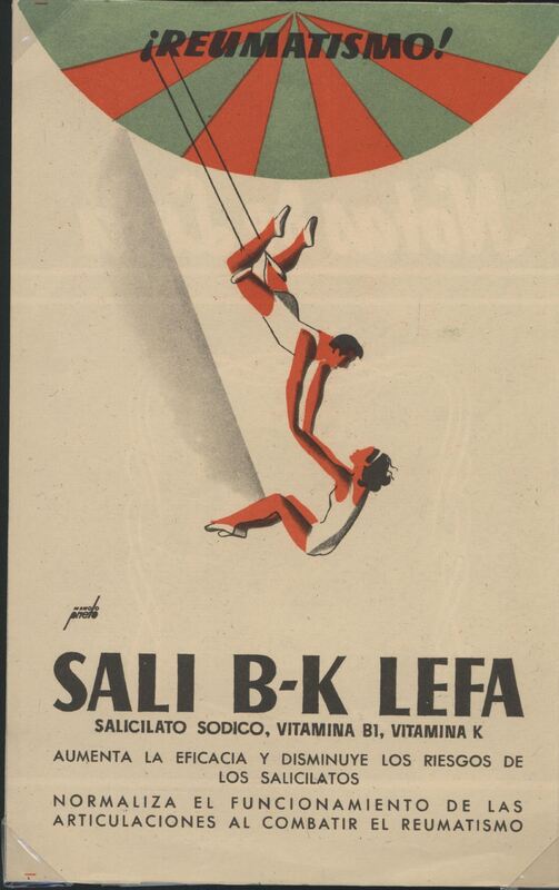 - Cartel anunciando una marca contra el reumatismo y el mal de huesos, con la imagen de una carpa y de dos trapecista en el aire, el hombre sobre un columpio agarra a una mujer en pleno vuelo, debajo de ellos la leyenda correspondiente al spot publicitario.