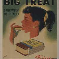 - Impresión sobre el papel de una revista, con el cartel publicitario de una marca de helados Frigo, con la imagen de una joven de perfil con el pelo recogido en una coleta, comiéndose el helado.