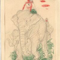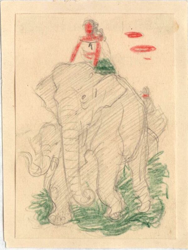 Sobre una masa verde dando la idea de que se trata de matorral y hierba dos elefantes caminan. Los dos elefantes son de color gris, con sus figuras muy bien contorneadas. El primero de ellos transporta a una persona, de piel oscura, pelo gris y vestimenta verde.Boceto realizado para la ilustración de la revista semanl Novelas y Cuentos. Titulo: Autor: Nº public.: Fecha: Tomo NC.: PI/. 381.